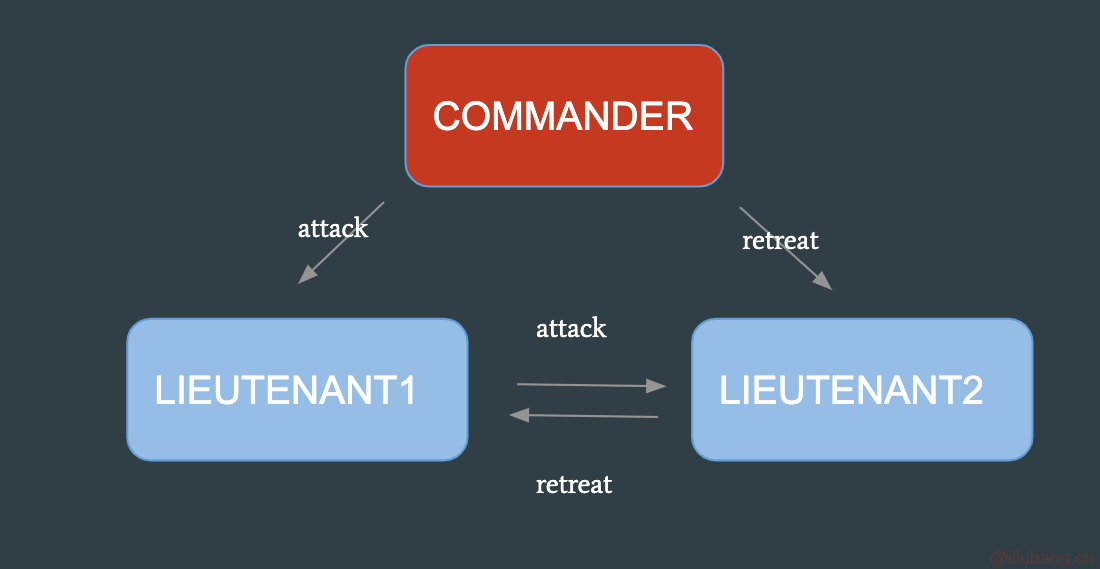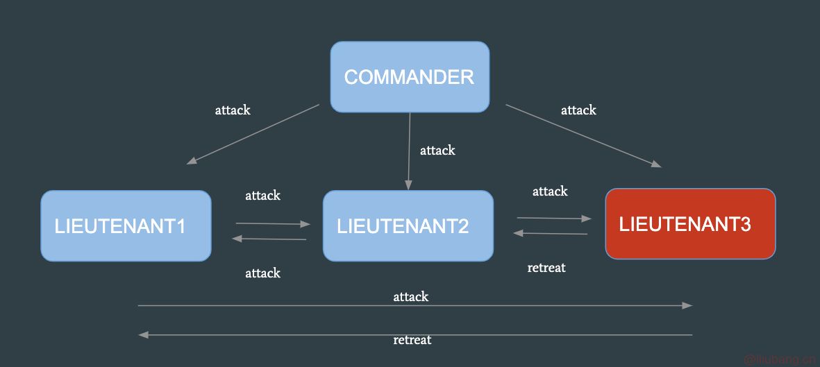 - 假如 LIEUTENANT2 叛变,LIEUTENANT1 收到的作战指令就是“进攻,撤退”