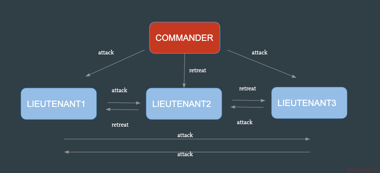 - 通过信使相互传递作战指令,进攻或者撤退