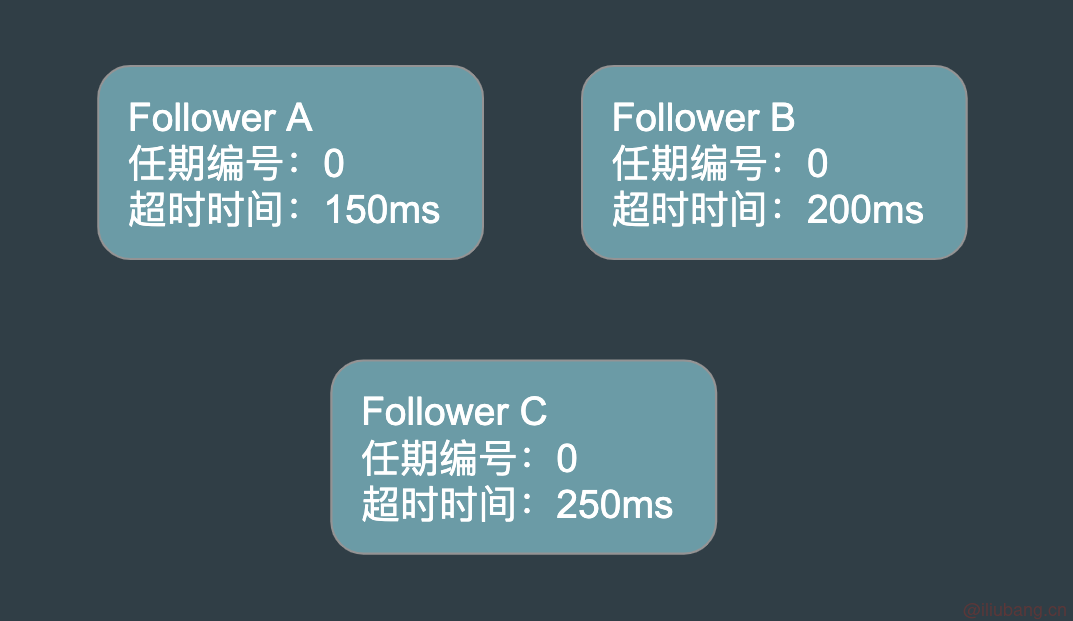 假设有 3 个节点 A,B,C,初始阶段任期编号都为 0,Raft 实现了随机超时,也就是每个节点等待 Leader 心跳的超时时间是随机的。