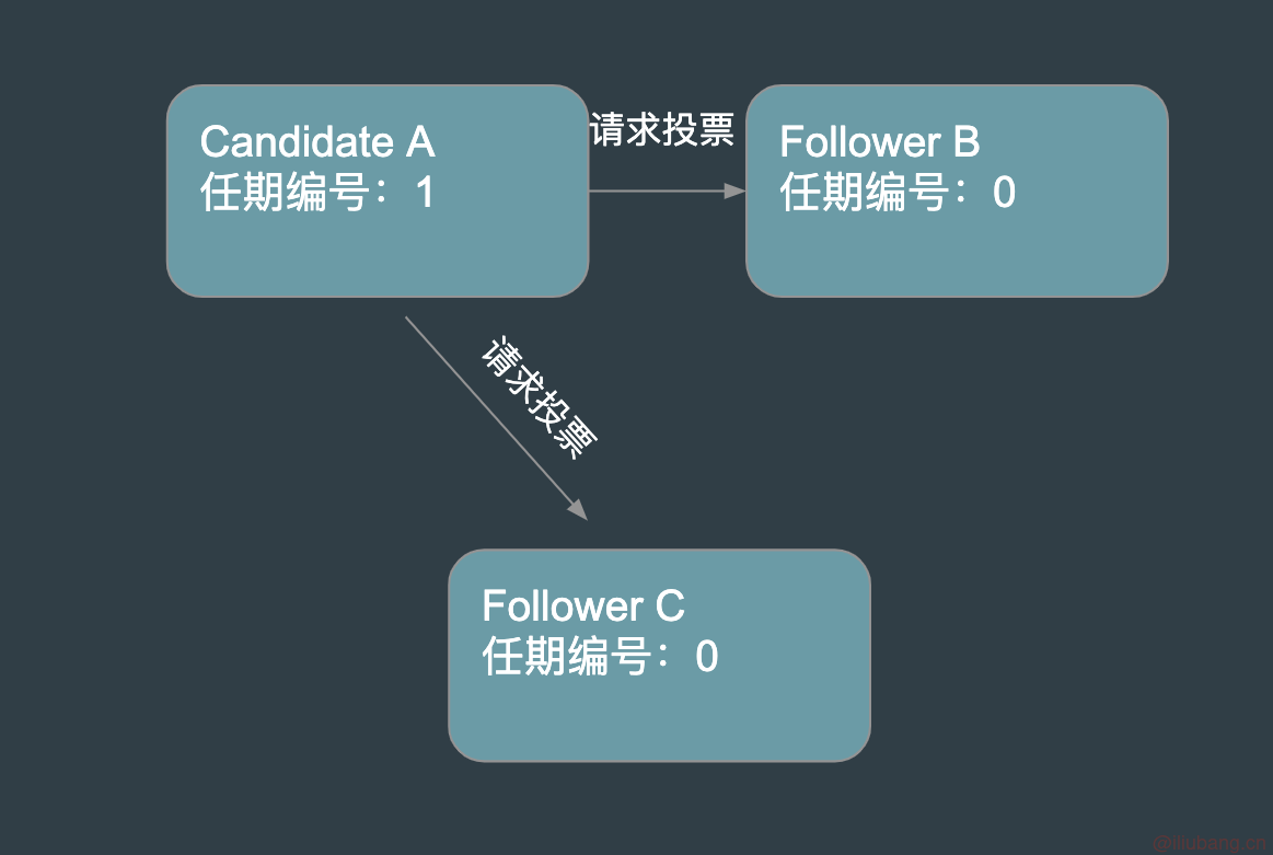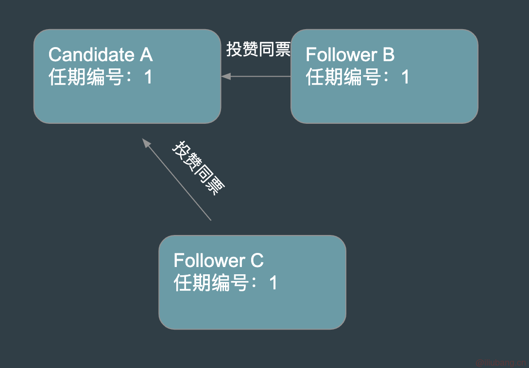 B 和 C 在收到 A 的请求后,由于在任期编号为 1 的这届任期内,还没有收到其他的投票请求,B 和 C 将自己本地的任期编号改为候选人 A 发起的任期编号,并将赞同票投给 A。