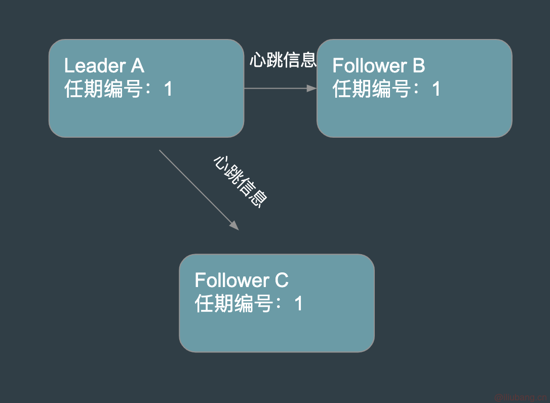节点 A 顺利赢得了大多数选票,成功晋升为 Leader。并且周期性的向 B 和 C 发送心跳信息,防止 Follower 节点发生新的选举,导致“篡权”。
