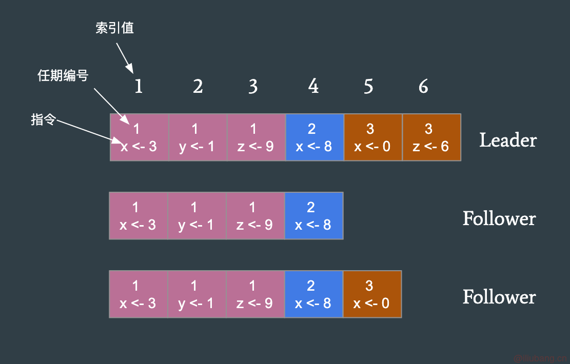 - 任期编号:创建这条日志项的 Leader 的任期编号