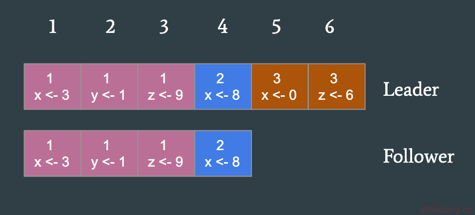 - Leader 通过日志复制 RPC 消息,发送当前最新的日志项到 Follower,此时 PrevLogEntry 为 5,PrevLogTerm 为 3